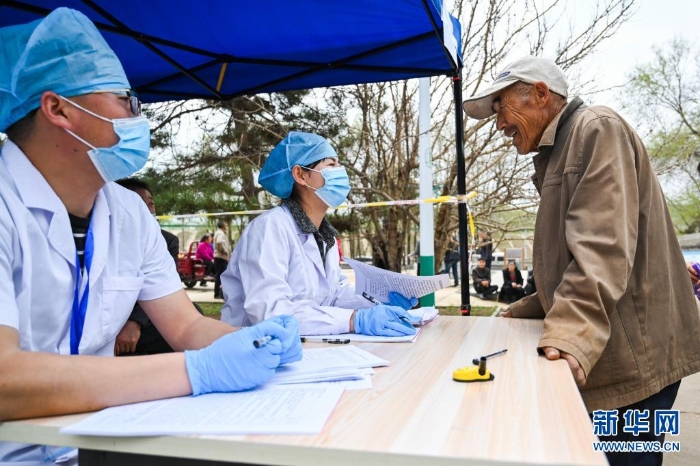 5月13日,在大榆樹(shù)鄉(xiāng)大榆樹(shù)村,醫(yī)務(wù)人員為準(zhǔn)備接種新冠疫苗的村民測(cè)量血壓。