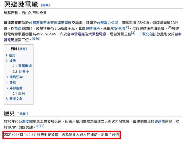 不僅如此,興達(dá)發(fā)電廠的維基百科內(nèi)容也被修改,歷史部分變成“2021/5/13 14:37無法用愛發(fā)電,因?yàn)榻谷伺c人的連結(jié),出事了阿伯!”短短3句嗆爆興達(dá)發(fā)電廠停電事故,同時(shí)還不忘串起3個(gè)時(shí)事梗,讓人看了哭笑不得,不過目前維基百科已被修正回原來模樣。