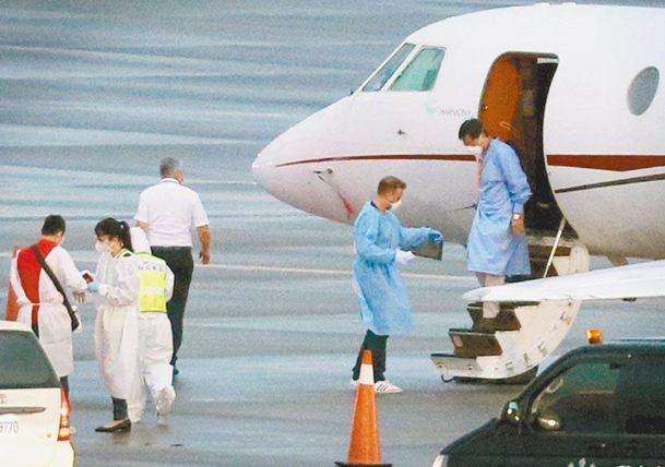 圖為臺(tái)灣地區(qū)“駐印度代表處”官員8日搭乘醫(yī)療專機(jī)飛抵桃園機(jī)場(chǎng)。(圖片來源:臺(tái)灣《中時(shí)電子報(bào)》)