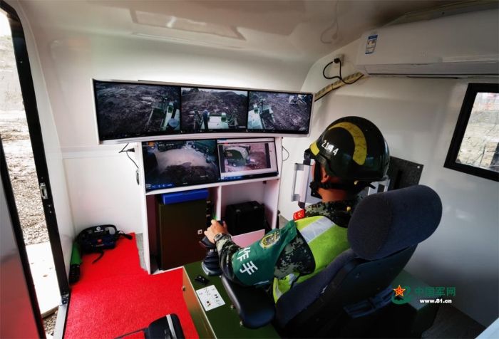 武警第二機(jī)動(dòng)總隊(duì)某支隊(duì)操作手在操作倉內(nèi)對無人智能推土機(jī)進(jìn)行遙控作業(yè)。李鵬 攝