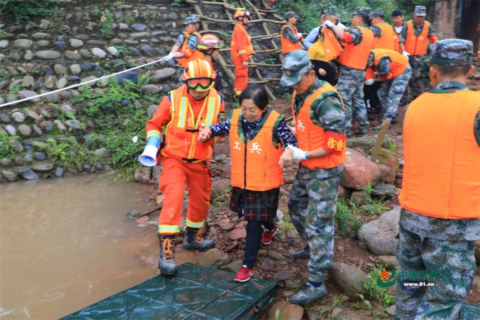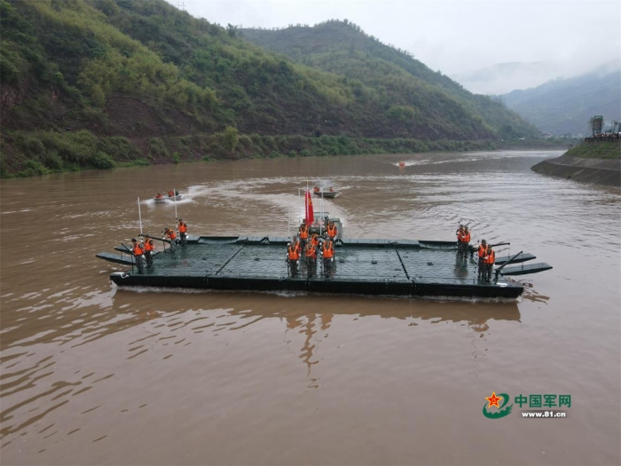 演習(xí)模擬道路中斷、橋梁震毀情況,武警第二機(jī)動(dòng)總隊(duì)某支隊(duì)的無人推土機(jī)與雅安路橋公司合力搶通道路,第77集團(tuán)軍某工兵旅水上救援分隊(duì)快速結(jié)合50噸漕渡門橋,打通大型機(jī)械投入救援的快速通道。