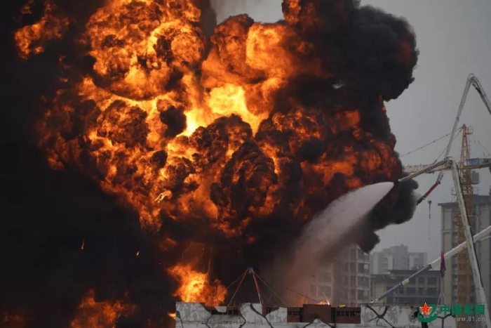 演習(xí)現(xiàn)場,消防隊(duì)員在進(jìn)行罐體滅火。中國軍網(wǎng)記者馬嘉隆 攝