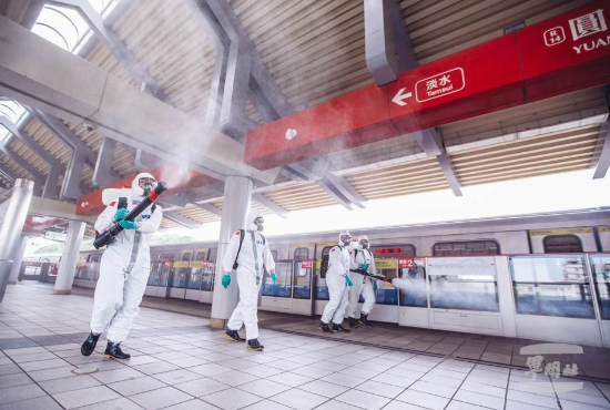 圖為臺(tái)軍33化學(xué)兵群前往臺(tái)北市捷運(yùn)站實(shí)施消毒。(軍聞社提供)