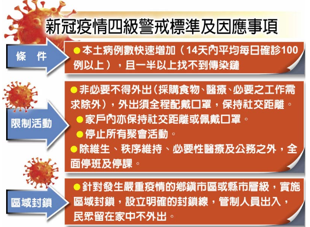 新冠疫情四級警戒標(biāo)準(zhǔn)及因應(yīng)事項。圖片來源:臺灣《中國時報》