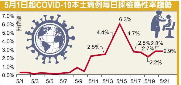 5月1日起COVID-19本土病例每日采檢陽性率趨勢(shì)。圖片來源:臺(tái)灣《中國(guó)時(shí)報(bào)》