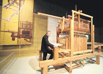 工作人員在復原的漢代提花機上演示織錦。杜建坡攝