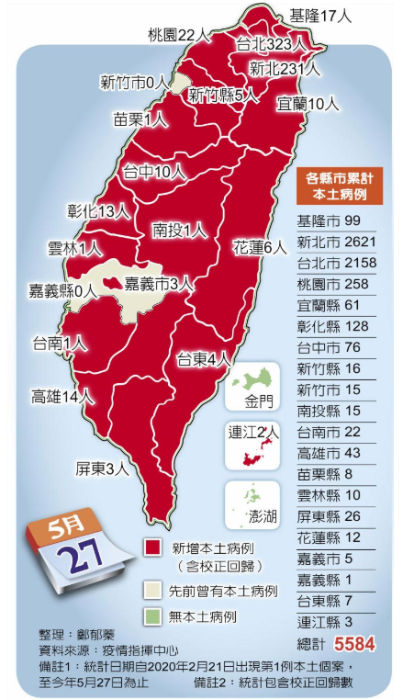 臺灣各縣市累計本土病例。圖片來源:臺灣《中國時報》
