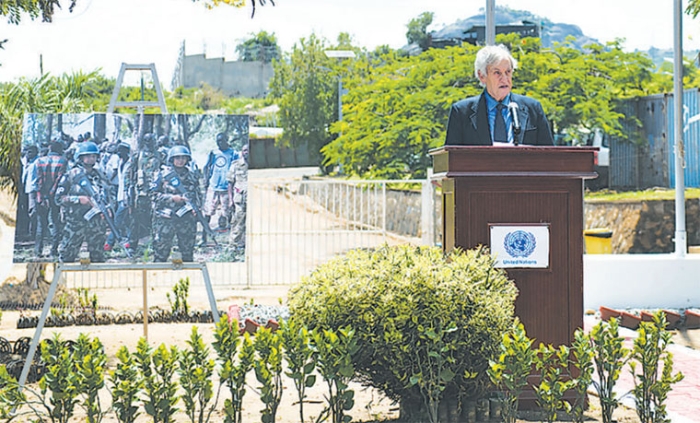 △ 在第19個(gè)聯(lián)合國(guó)國(guó)際維和人員日到來(lái)之際,聯(lián)南蘇團(tuán)舉行活動(dòng)紀(jì)念在南蘇丹維和任務(wù)中殉職的維和人員,聯(lián)合國(guó)秘書(shū)長(zhǎng)特別代表發(fā)表講話?!〗埚螖z
