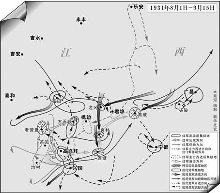 毛澤東毅然決定千里回師,率紅軍主力從建寧出發(fā),到贛南興國集中。隨后,紅一方面軍和從贛江以西東渡的紅七軍會合。8月初,部隊集中在以高興圩為中心的方圓幾十里的地區(qū)。各路敵軍紛紛逼近,形成對紅軍半包圍的態(tài)勢。紅軍從敵軍中間40里的空隙地帶向東突進,從8月7日到11日在蓮塘、良村、黃陂,三戰(zhàn)三捷,殲敵1萬余人。敵人發(fā)現(xiàn)我軍在黃陂地區(qū)后,集中主力與我決戰(zhàn)。紅一方面軍以一部兵力向東北方向佯動,調動敵人,主力向西急進,使敵疲于奔命。在我軍的不斷打擊下,敵被我拖得疲憊不堪,已無力再戰(zhàn),蔣介石被迫于9月初下令“圍剿”軍總退卻。毛澤東、朱德令紅軍發(fā)起反擊,取得老營盤、方石嶺戰(zhàn)斗的勝利,粉碎了國民黨軍的第三次“圍剿”。至9月15日,紅一方面軍共擊潰敵人7個師,殲敵17個團,斃傷俘敵3萬余人,繳槍2萬余支。