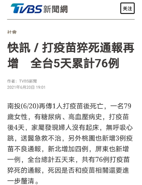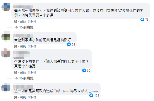 【華夏經(jīng)緯網(wǎng)報道】自臺灣開放接種AZ疫苗以來,已傳出近百的死亡案列,據(jù)臺灣《聯(lián)合報》報道,臺灣云林縣發(fā)生第一樁疑似母親昨天施打完AZ疫苗,回家哺乳喂食兩個月大女嬰母乳,今天早上發(fā)現(xiàn)女嬰猝死。至于女嬰死因是否與母親接種疫苗有關(guān),仍待進(jìn)一步查驗(yàn)。此外,臺灣疫苗廠商高端公司緊急加快生產(chǎn)腳步,打算略過三期臨床試驗(yàn),再次引發(fā)了島內(nèi)民眾對施打疫苗的恐慌情緒,島內(nèi)多名學(xué)者、藝人喊話民進(jìn)黨當(dāng)局,放下政治偏見,兩岸聯(lián)合抗疫。 島內(nèi)網(wǎng)友痛心表示,“每天都死那么多人,民進(jìn)黨當(dāng)局還可以告訴大家,并沒有因?yàn)槭┐駻Z疫苗死亡的案例?臺灣民眾要自求多福”、“孕婦接下來要打了,陳時中有評估安全性嗎?”、“這一切都是民進(jìn)黨當(dāng)局造成的坡口,導(dǎo)致家破人亡”…… 臉書網(wǎng)友留言截圖