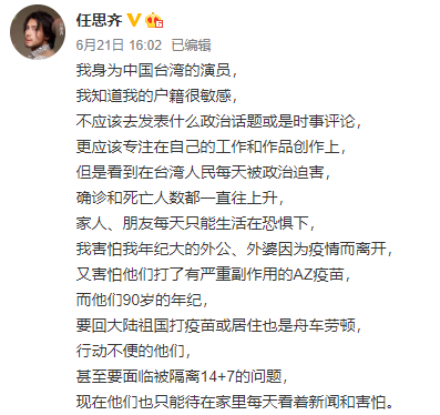 自嘲“沒有名氣的小演員”的臺灣藝人任思齊在個人微博上表示自己6月中旬剛在上海接種完疫苗,他看到在臺灣人民每天被政治迫害,確診和死亡人數(shù)都一直往上升,家人、朋友每天只能生活在恐懼下,“害怕我年紀(jì)大的外公、外婆因?yàn)橐咔槎x開,又害怕他們打了有嚴(yán)重副作用的AZ疫苗”,此外,他還提到“在大陸有將近8萬臺胞打了大陸疫苗,并沒有任何人因?yàn)檫@疫苗而死亡”,呼吁更多有影響力的臺胞們,“不管是臺商、企業(yè)家、教育家等等…或是藝人、歌手、演員,希望大家站出來,幫助臺灣渡過疫情。更希望有影響力的你們可以告訴臺灣民眾,祖國大陸并沒有迫害你們,真正迫害臺灣人民的就是臺灣的政客。” 圖片來源:微博截圖