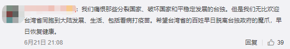 大陸網(wǎng)友紛紛熱心回復(fù),歡迎愿意接種大陸疫苗的臺灣同胞來大陸:“我們是反'臺獨(dú)'不是反臺灣人民”、“心疼臺灣同胞!生死存亡!”、“我們痛恨那些分裂國家、破壞國家和平穩(wěn)定發(fā)展的'臺獨(dú)',但是我們無比歡迎臺灣同胞到大陸發(fā)展、生活、包括看病打疫苗”…… 網(wǎng)友留言截圖