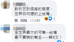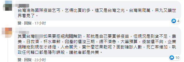 國臺辦發(fā)言人馬曉光也在21日的記者會上表示,臺灣此輪疫情肆虐已一個多月,嚴(yán)重危及廣大臺灣同胞生命健康安全。截至6月21日,臺灣新冠肺炎確診病例累計14080例,死亡569例,染疫死亡率超過4%,目前島內(nèi)疫苗接種率僅約6%。我們對當(dāng)前臺灣疫情和廣大臺灣同胞生命健康安全十分憂慮,多次表示愿盡最大努力協(xié)助廣大臺灣同胞戰(zhàn)勝疫情,讓廣大臺灣同胞盡快有疫苗可用,愿意提供被世界衛(wèi)生組織納入全球“緊急使用清單”的大陸疫苗,或上海復(fù)星醫(yī)藥集團參與研發(fā)和代理的德國BNT疫苗,上海、江蘇、福建的民間機構(gòu)還宣布要為島內(nèi)捐贈一批疫苗。 馬曉光說,我們希望看到并愿積極協(xié)助廣大臺灣同胞早日戰(zhàn)勝疫情。但遺憾的是,民進黨當(dāng)局卻大搞“政治防疫”,無視島內(nèi)民眾生命健康,無視大陸善意,將疫苗賦予政治顏色,不斷頑固進行政治操弄,延續(xù)制造兩岸對抗的政治戲碼,廣大臺胞仍無法從大陸得到安全、有效和足量的疫苗,島內(nèi)有效防疫的寶貴時間一再流失。利用疫苗搞政治,就是對廣大臺灣民眾生命健康的極端不負責(zé)任和無端戕害。 島內(nèi)民眾也紛紛嘲諷,“對于乞討疫苗的態(tài)度,世界如何趕得上臺灣”、“全世界最大的丐幫,臺灣” 還有民眾認為,接受疫苗捐贈是“無能的表象”、“臺灣淪為國際疫苗乞丐,乞得比買得多,這又是臺灣之光”……