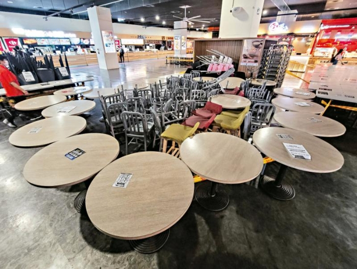 圖:島內(nèi)疫情嚴(yán)峻,全臺(tái)實(shí)施三級(jí)警戒。圖為美食街收起桌椅,暫停堂食。\中央社
