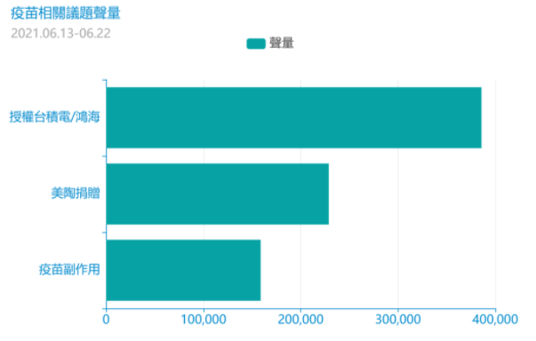 首先,筆者比較上周幾項疫苗議題的聲量后發(fā)現(xiàn),民進(jìn)黨當(dāng)局授權(quán)臺積電與鴻海購買疫苗的聲量在短短幾天就接近40萬筆,也比美陶捐贈、疫苗副作用等事件都高。這反映出,相對于施打疫苗副作用的擔(dān)憂以及從美國與立陶宛獲得疫苗捐贈的喜悅,民眾對于臺積電與鴻海被授權(quán)代表臺當(dāng)局購買疫苗更加期待。筆者認(rèn)為可能的原因有兩點:一、臺積電及鴻海實力雄厚,島內(nèi)民眾認(rèn)為能取得疫苗的能力說不定比民進(jìn)黨當(dāng)局還要高,期待理所當(dāng)然也高。二、兩個民間單位合購1000萬劑疫苗,這個數(shù)量讓民眾相當(dāng)有感。
