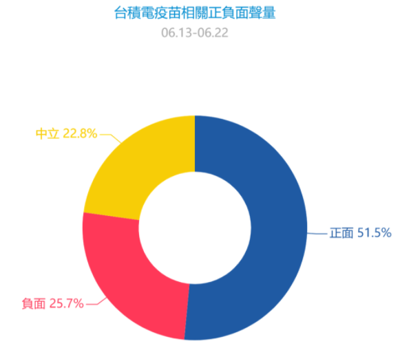另外,筆者分析臺積電過去10天有關(guān)疫苗的正負(fù)面聲量,其中超過50%以上的聲量為正面聲量,負(fù)面聲量僅25%。這結(jié)果不僅再次印證民眾對臺積電的期待感,相較于高端解盲時的高負(fù)面聲量,網(wǎng)友似乎更樂見從海外取得足夠的疫苗。