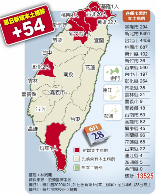 各縣市累計(jì)本土病例。圖片來(lái)源:臺(tái)灣《中國(guó)時(shí)報(bào)》