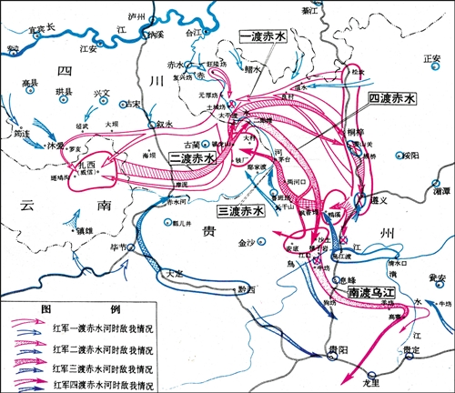 紅軍一渡赤水后,各路敵軍蜂擁而至,進行圍追堵截。面對敵情變化,黨中央和中革軍委當機立斷,暫緩執(zhí)行北渡長江計劃,在扎西地區(qū)集結(jié)。當各路敵軍奔向扎西時,紅軍突然調(diào)頭東進,二渡赤水,再打遵義。敵人再次集結(jié)重兵,妄圖殲滅紅軍于遵義、鴨溪狹窄地區(qū)。沒想到,紅軍三渡赤水,佯作北渡長江之勢,迫使敵人重新調(diào)整部署。當敵人部署尚未就緒時,紅軍又出敵不意四渡赤水,南渡烏江,兵臨貴陽直逼昆明,隨后巧渡金沙江,跳出了數(shù)十萬敵軍圍追堵截的包圍圈。