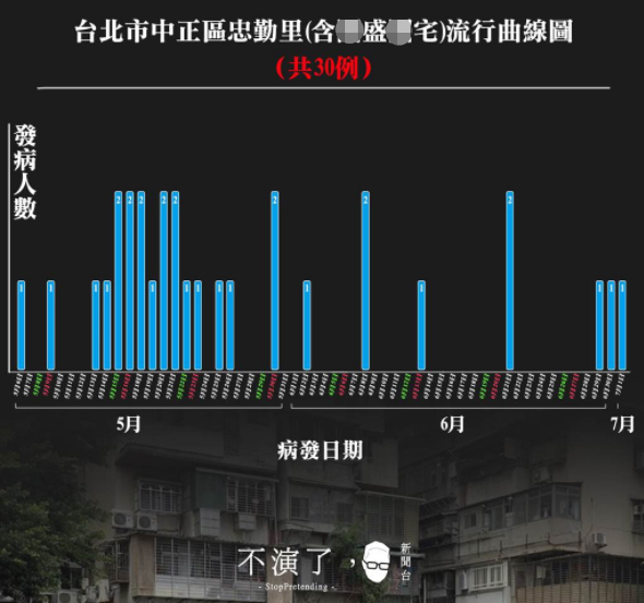 朱凱翔12日在臉書粉絲專頁“不演了新聞臺”發(fā)文表示,有人問他,臺北市又是“虎林項目”,又是“忠勤項目”,疫情真的有這么樂觀嗎?針對這個問題,他刊出“忠勤項目”所在地臺北市中正區(qū)忠勤里確診累計圖,指當時在媒體報導與議員指證下,大家可能又以為是30人確診的大規(guī)模群聚感染,但爬梳資料后發(fā)現(xiàn),這30人其實是從5月6日以來的累計,高峰起伏的時間,與臺北市整體走勢大致相同。6月29日到7月1日連續(xù)3天有人確診。