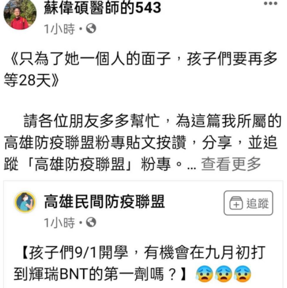 蘇偉碩轉(zhuǎn)貼他所屬的“高雄民間防疫聯(lián)盟”臉書,“反萊豬”三劍客之一的王文心博士詳細(xì)爬梳蔡英文為了改標(biāo)簽,以便在疫苗進(jìn)口時將全部功勞攬?jiān)谧约荷砩?,卻讓BNT疫苗的進(jìn)口時間額外拖延將近28天,擋住9月初孩子們安心開學(xué)的希望。
