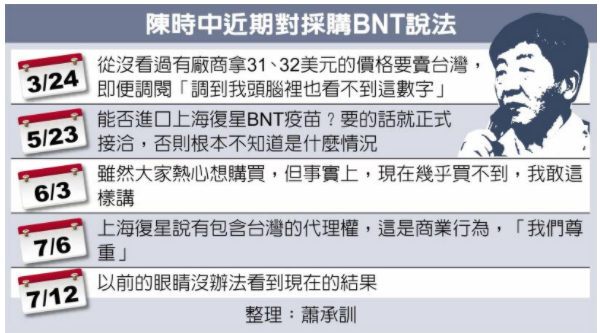 這次民間捐贈以“這種價格”采購BNT成功后,陳時中曾經(jīng)說的話被翻出來,然而他又拋出“時空背景不同”蒙混過關(guān),“以前的眼睛沒辦法看到現(xiàn)在的結(jié)果”,未來也可能有很多不同售價, “在前面的時間上,我們沒辦法了解后面價格的變化”。他強(qiáng)調(diào)疫苗市場千變?nèi)f化,根據(jù)采購時機(jī)、數(shù)量的不同,因此國際間在買疫苗或藥物,都屬于保密事項。