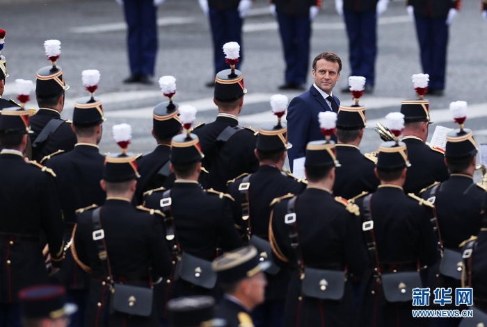 7月14日,法國(guó)總統(tǒng)馬克龍?jiān)诎屠鑵f(xié)和廣場(chǎng)國(guó)慶閱兵式現(xiàn)場(chǎng)檢閱隊(duì)伍。