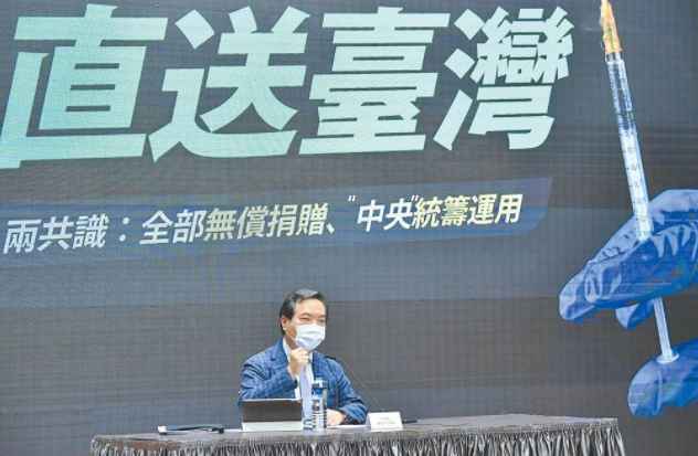 臺行政機構(gòu)舉行BNT疫苗捐贈記者會,只見正“中央”原廠制造、原廠標簽和大大的“直送臺灣”字樣,右下角寫著兩點共識——全部無償捐贈、“中央”統(tǒng)籌分配;完全不見感謝捐贈者鴻海永齡基金會和臺積電的字樣。(美聯(lián)社)