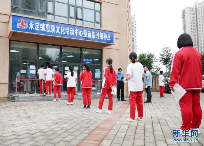 7月21日,來自首都師范大學(xué)附屬中學(xué)永定分校的學(xué)生在北京市門頭溝區(qū)永定鎮(zhèn)惠康文化活動中心疫苗臨時接種點排隊等候接種新冠病毒疫苗。