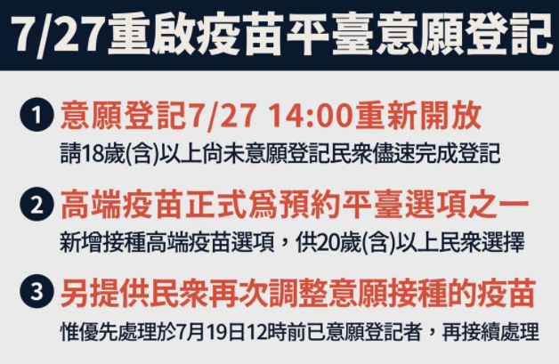 臺(tái)灣流行疫情指揮中心表示,疫苗意愿登記平臺(tái)今14時(shí)再次開放,并新增高端選項(xiàng)。(圖/指揮中心提供)