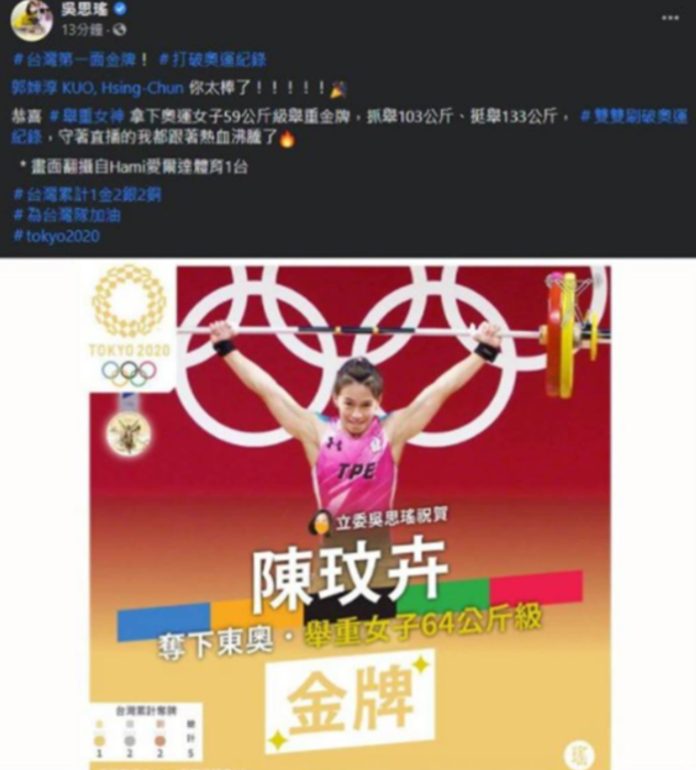 臺灣“舉重女神”郭婞淳創(chuàng)奧運紀錄奪金,民進黨“立委”吳思瑤確把“郭婞淳”寫成“陳玟卉”。(取自PTT)