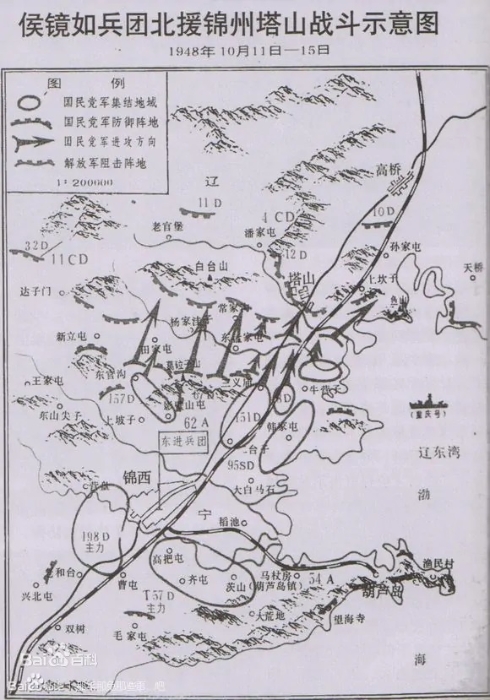 錦州守敵計有范漢杰指揮的第九十三軍、新八軍各兩個師,新六軍1個師及原屬第六十軍的1個師,共6個師,連同特種兵、后勤及地方部隊約10萬人。敵人憑借炮臺山、雙山子西山、罕王殿南山、紫荊山、亮馬山等高地,以鋼筋混凝土工事為骨干,構成若干支撐點式的獨立堅守據(jù)點,作為外圍陣地;依托小凌河、女兒河和城垣構成主陣地;以城內高大建筑物交通大學、日偽神社、中紡公司、老城等構成內城核心據(jù)點。為拱衛(wèi)錦州,還以第九十三軍1個師位于義縣,新八軍1個師位于高橋,第五十四軍位于錦西、葫蘆島和興城,新五軍位于綏中、山海關、秦皇島和北戴河之線。此外,華北“剿總”所屬第六十二軍等部4個師位于唐山至昌黎一線。