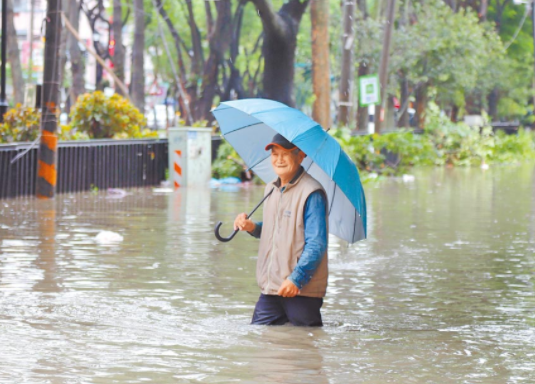 嘉義縣新港鄉(xiāng)2日累積雨量逾300毫米,奉天宮前中山路一帶積淹水嚴(yán)重,水深一度達(dá)到成人的大腿高度,讓居民也不禁苦笑。(圖片來源:臺灣《中國時報》)