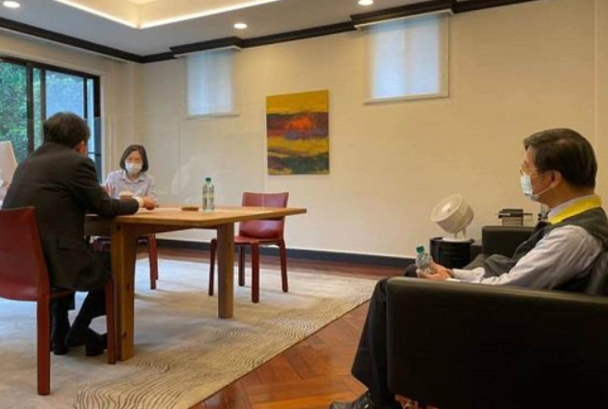 臺灣地區(qū)領導人蔡英文5月27日在臉書貼出一張,與臺衛(wèi)福部門主管陳時中見面討論防疫和疫苗進度的側拍照。(圖/取自蔡英文臉書)