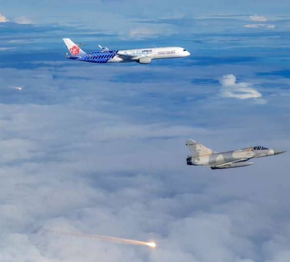 中國臺北東京奧運羽毛球男子雙打金牌選手王齊麟李洋及羽毛球女子單打選手戴姿穎4日返臺,臺軍以幻象2000戰(zhàn)機伴飛華航,并施放熱焰彈。圖片來源:臺灣《中國時報》