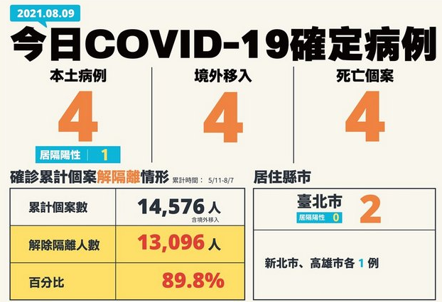 指揮中心表示,今日新增之4例本土病例(其中1例為居家隔離期間或期滿檢驗(yàn)陽性者),均為男性,年齡介于30多歲至50多歲,發(fā)病日介于今年8月7日至8月8日。個(gè)案分布為臺(tái)北市2例、新北市及高雄市各1例;其中1例為已知感染源、3例關(guān)聯(lián)不明,將持續(xù)進(jìn)行疫情調(diào)查,以厘清感染源。