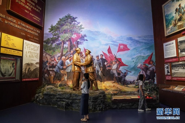 7月15日,觀眾在中國共產(chǎn)黨歷史展覽館“‘不忘初心、牢記使命’中國共產(chǎn)黨歷史展覽”上觀看紅軍長征過草地場景視頻。新華社記者 陳曄華 攝