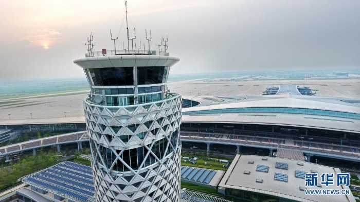 這是青島膠東國(guó)際機(jī)場(chǎng)塔臺(tái)(8月11日攝,無(wú)人機(jī)照片)。