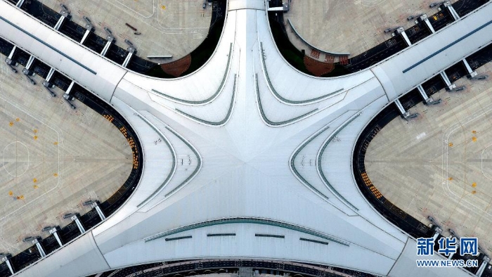 青島膠東國(guó)際機(jī)場(chǎng)航站樓采用集中式單體五指廊造型(8月11日攝,無(wú)人機(jī)照片)。