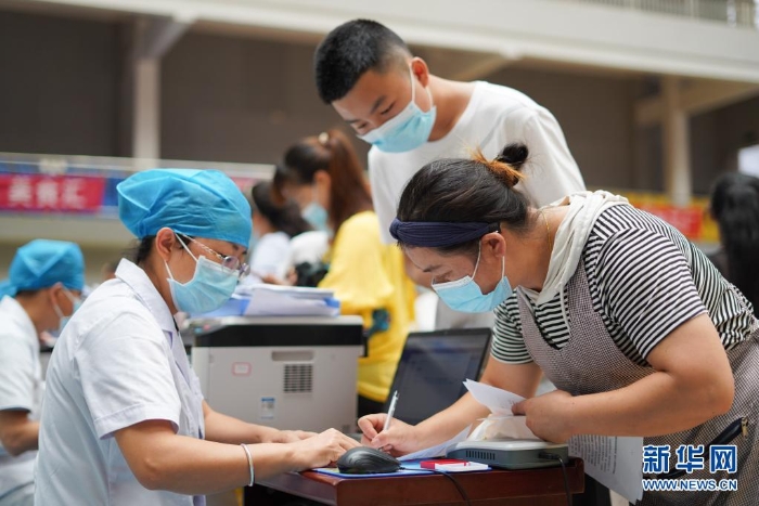 8月12日,在貴州省丹寨縣體育館接種點,學(xué)生和家長在確認(rèn)疫苗接種信息。