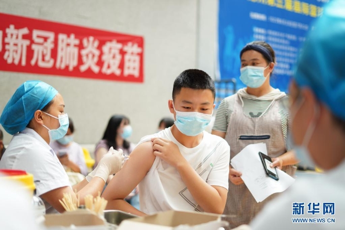 8月12日,一名未成年人在浙江省麗水市景寧畬族自治縣新冠疫苗接種點接種疫苗。