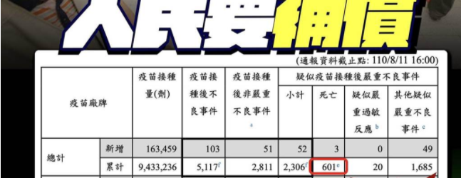 民眾配合臺當(dāng)局防疫政策而施打疫苗,但因疫苗所面對的各種風(fēng)險(xiǎn),指揮中心卻未能有效響應(yīng)民眾的擔(dān)憂,將會一再重創(chuàng)民眾對于防疫政策的配合程度,指揮中心所公布的“臺灣COVID-19疫苗安全性監(jiān)測”中,截至12日已有高達(dá)601例死亡案例,這些都嚴(yán)重影響民眾未來配合政策接種意愿。
