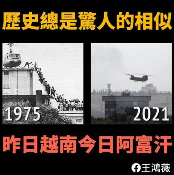 美軍狼狽撤僑的照片也隨之曝光,有島內(nèi)網(wǎng)友把這一幕聯(lián)想到1975年美軍撤離越南西貢的畫面,不僅感嘆:“昨日越南,今日阿富汗,明日……?”而一直幻想“兩岸開戰(zhàn)美軍會來支持”的臺灣,未來可以仰賴美國的保護(hù)嗎?相信臺灣民眾內(nèi)心都有答案了。