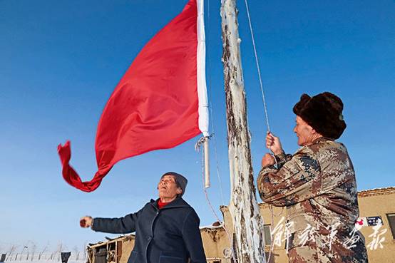 幾十年來,每一個(gè)清晨,魏德友和劉京好都會在院子里升起一面五星紅旗。雖沒有國歌伴奏,但每一個(gè)升旗動(dòng)作,夫妻倆都是一絲不茍。傍晚巡邏回來,看到國旗就看到了家。這面國旗見證了老兩口的守邊歲月,也見證了一代代戍邊人守土衛(wèi)民的赤膽忠誠。