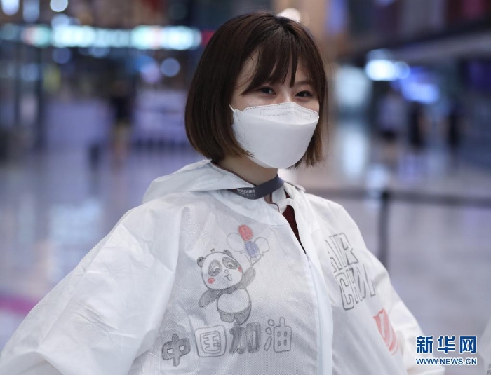 8月19日,在東京成田機(jī)場,一名國航工作人員身著為運動員加油打氣標(biāo)語的防護(hù)服。