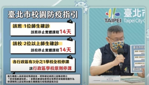 關于開學措施,柯文哲說,這次疫情還算控制,原則上實體上課,小朋友同學回學校上課了,請防疫假的傾向在教室后面掛攝影機,在線線下教學。萬一一個班級有一位師生確診,當然全班居隔14天,2位以上師生確診,就全校停止14天上課,這部分到時候看狀況決定。