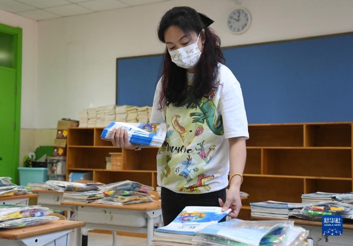 8月26日,在北京市海淀區(qū)太平路小學(xué),教師整理分發(fā)好的新學(xué)期教材。