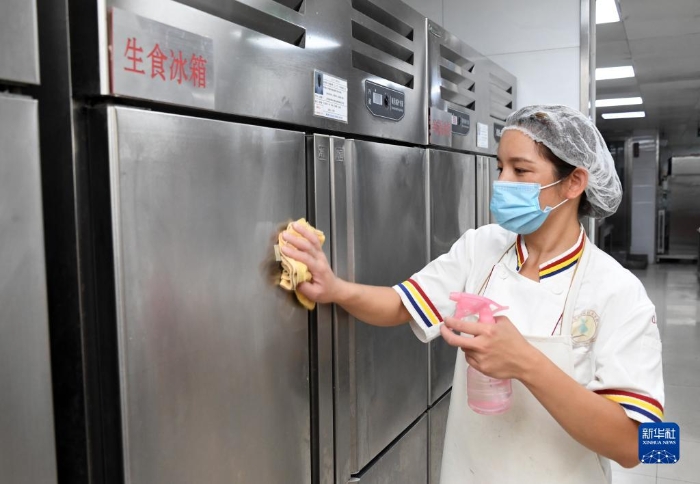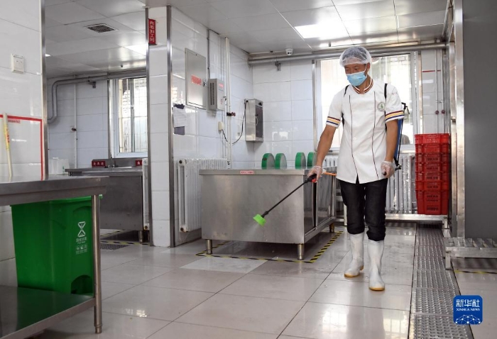 8月26日,在北京市海淀區(qū)太平路小學(xué),工作人員對食堂廚房進(jìn)行消毒。
