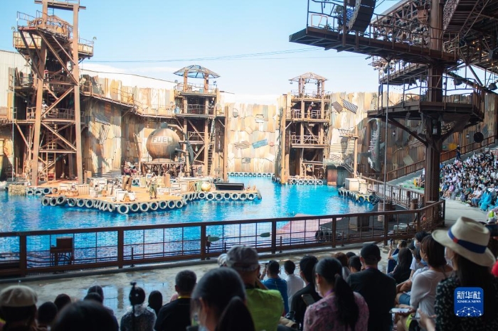 8月26日,游客在觀看北京環(huán)球影城未來水世界主題景區(qū)特技表演。