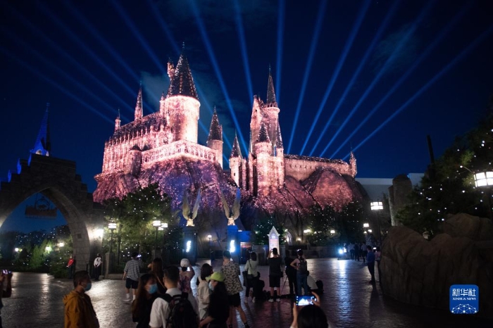 8月25日,游客在觀看北京環(huán)球影城哈利·波特的魔法世界主題景區(qū)霍格沃茨城堡夜間燈光慶典表演。