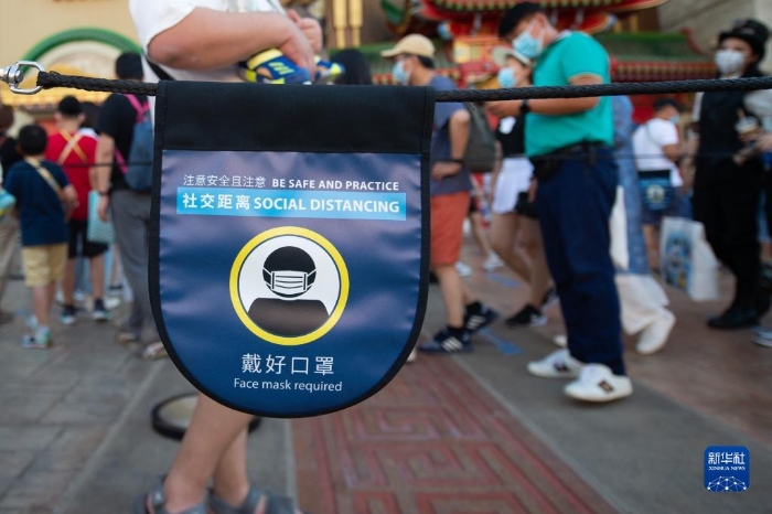 這是在北京環(huán)球影城好萊塢景區(qū)一劇場外排隊(duì)區(qū)域拍攝的防疫提示(8月26日攝)。